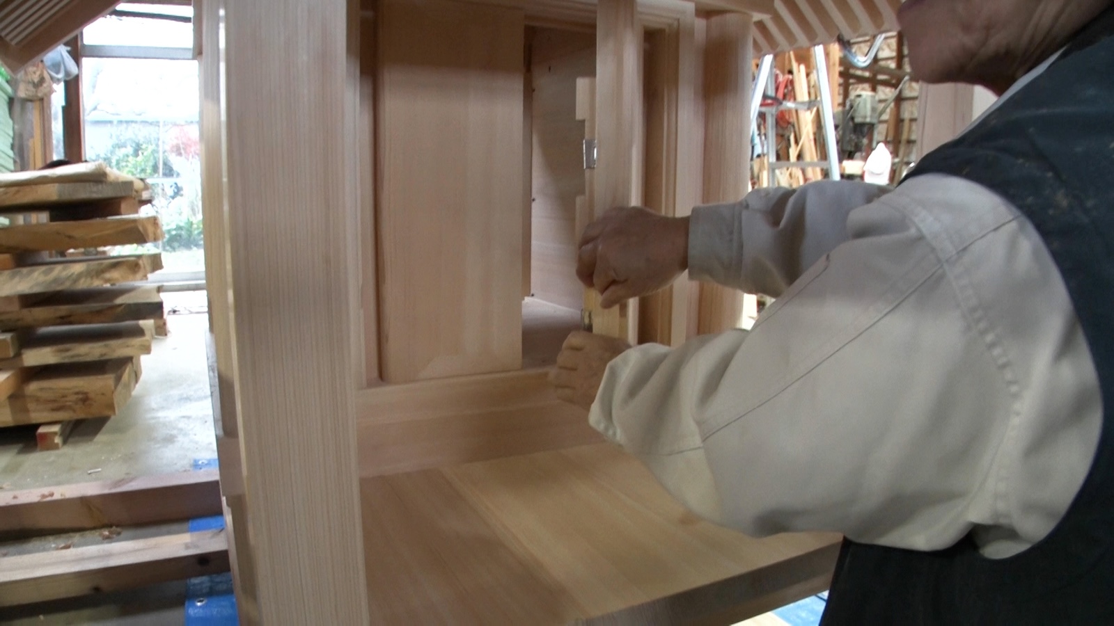 さらに祠作りに大事な技術が、本殿の扉『御扉(みとびら)』を神事などの際に開く時の音。御扉はご神体を守る大切な扉。この音が“神様にお会いできる合図”とされている。「いい加減に作ったら音が出ないよ。甘かったらいけんし」と、音の大切さを語る中尾さん。