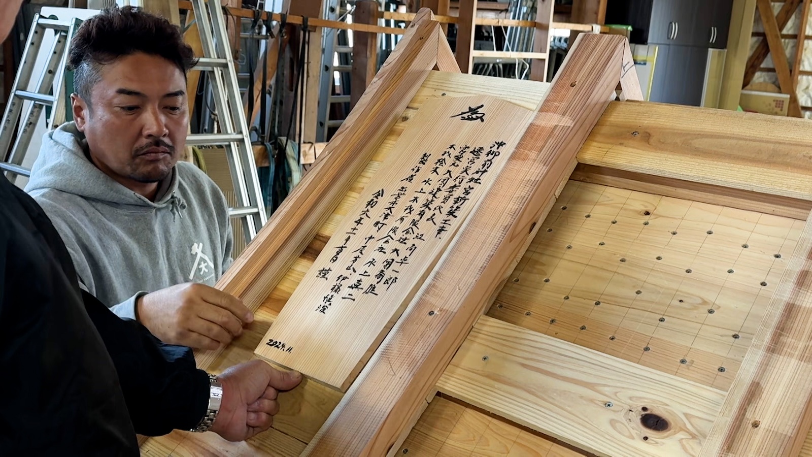 そしてこの日、中尾さんをはじめ大工の皆さんがうれしそうに何やら写真を撮っている。スタッフが「なんですかあれは?」と聞くと、『棟札(むなふだ)』といい、製作者の名前や工事の記録が記され、その建物の歴史を残す貴重な資料で、建物の安全、繁栄を祈り、屋根裏に取り付けられるのだという。次は60年後にならないと見られない棟札を、ちょうど貼り付けていたのだった。