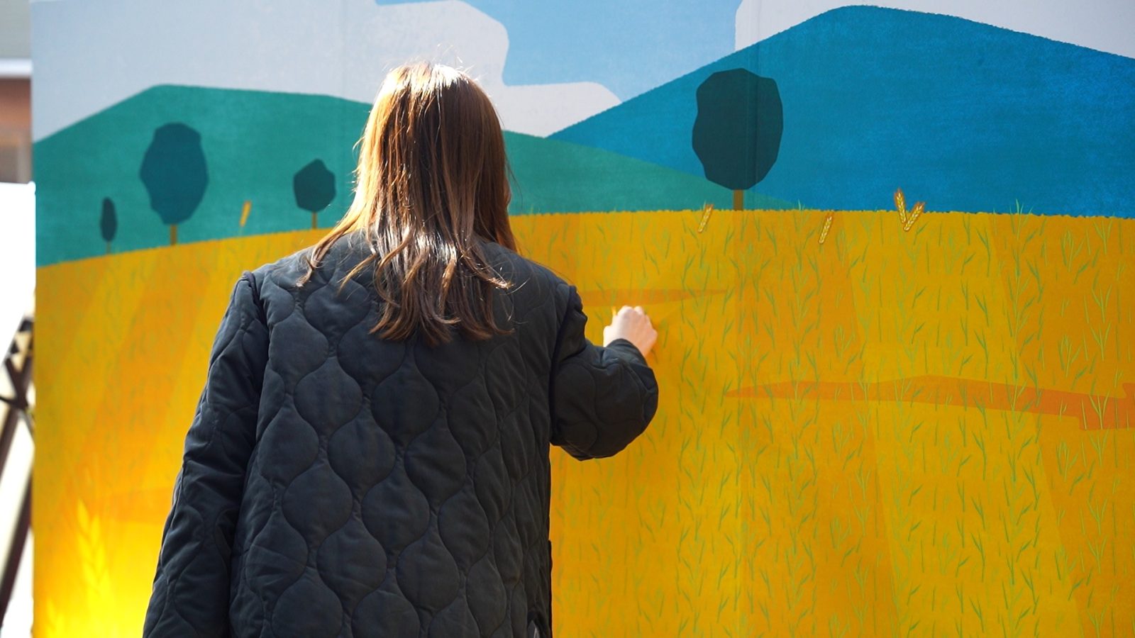 和小麦畑にシールを貼る様子