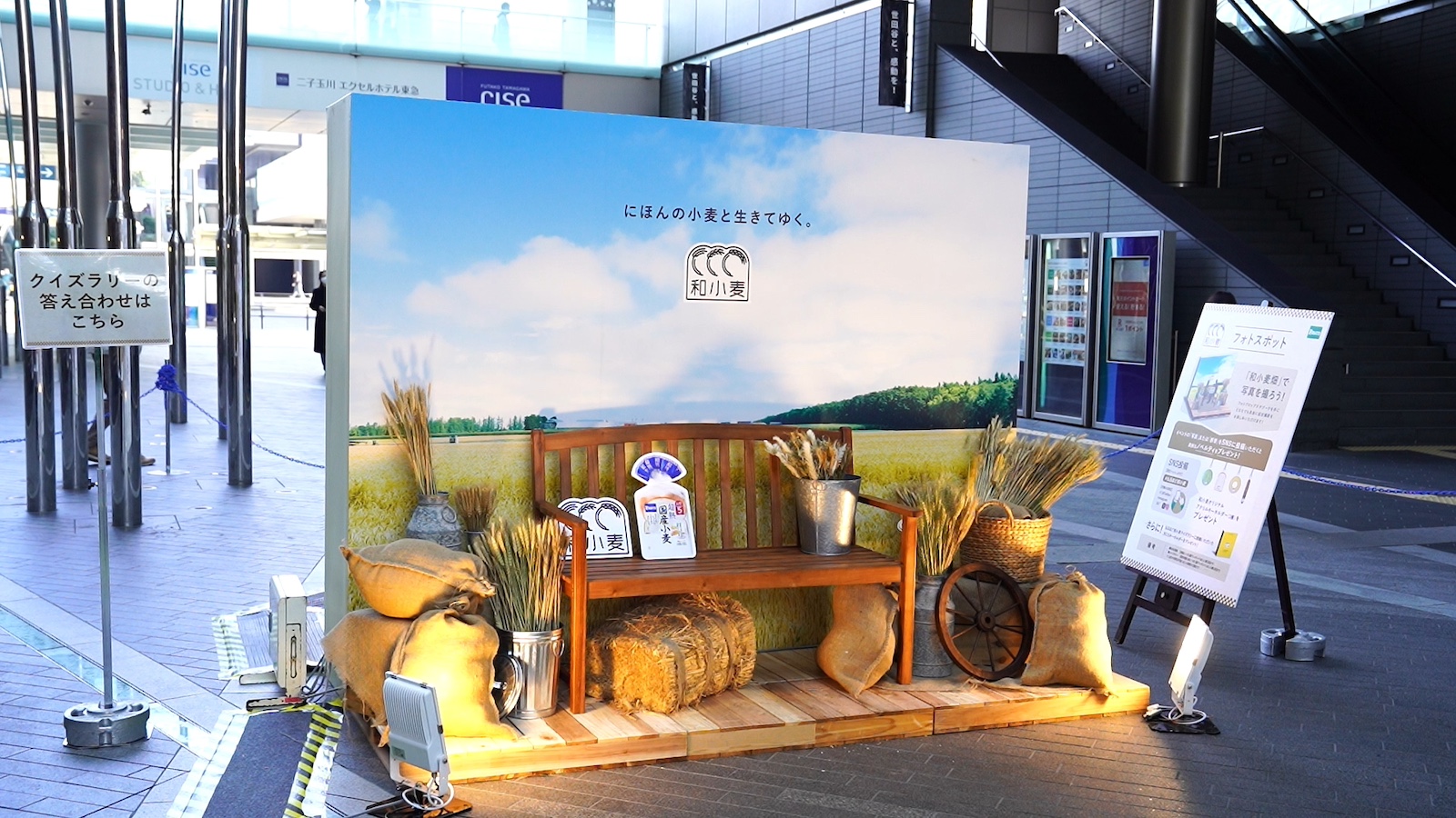 そんな長年の取り組みと新ブランド『和小麦』を広めるため、今回の国産小麦を五感で体験できるイベントが開催された。まず、二子玉川駅の改札を出てすぐに見える位置に設置されたのが、大きな麦畑のパネル。参加者一人ひとりが小麦に見立てたシールを貼っていき、大きな和小麦畑をみんなで作ろうというもの。